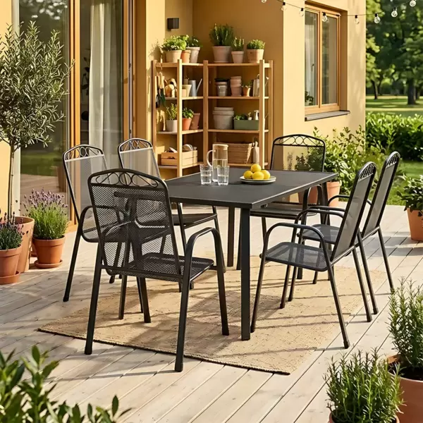 Ukoliko tražite nameštaj koji spaja eleganciju modernog dizajna sa robusnošću koja prkosi godinama, ova metalna garnitura je pravi izbor za vas. Sa prostranim stolom dužine 150 cm i šest udobnih stolica, ovaj set je srce svakog dvorišta ili terase.