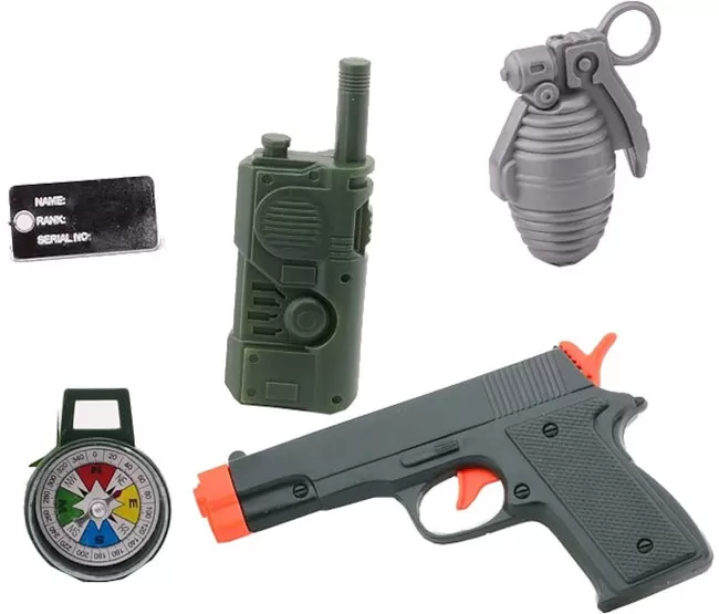 Set sadrži: pištolj, ručnu bombu, radio stanicu, pločicu za ime i kompas