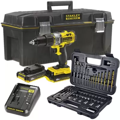 Kompaktna 18V udarna aku bušilica sa dve 2Ah baterije i kutijom. Podesiv obrtni moment. Dva smera rotacije. Pribor: burgije za različite namene,...