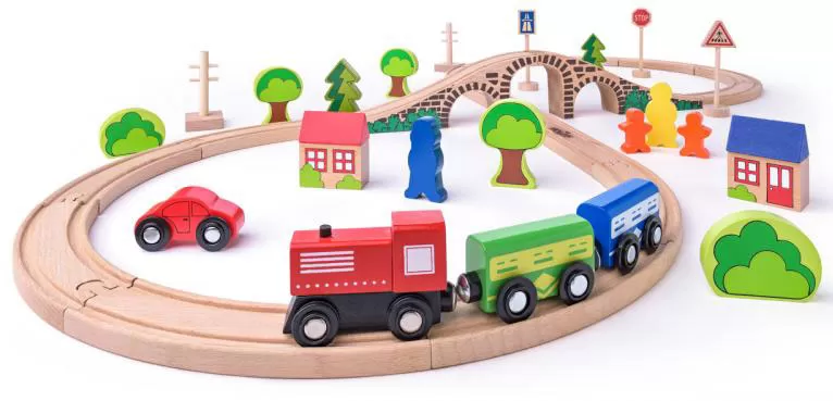 Drvena pruga Osmica sa mostom, a po njoj putuje drveni vozić! On pazi na saobraćajne znake, a putnici kroz prozore mogu videti kuće, drveće i ljude koji im mašu! Uživanje u igri! Uzrast: 3+.
