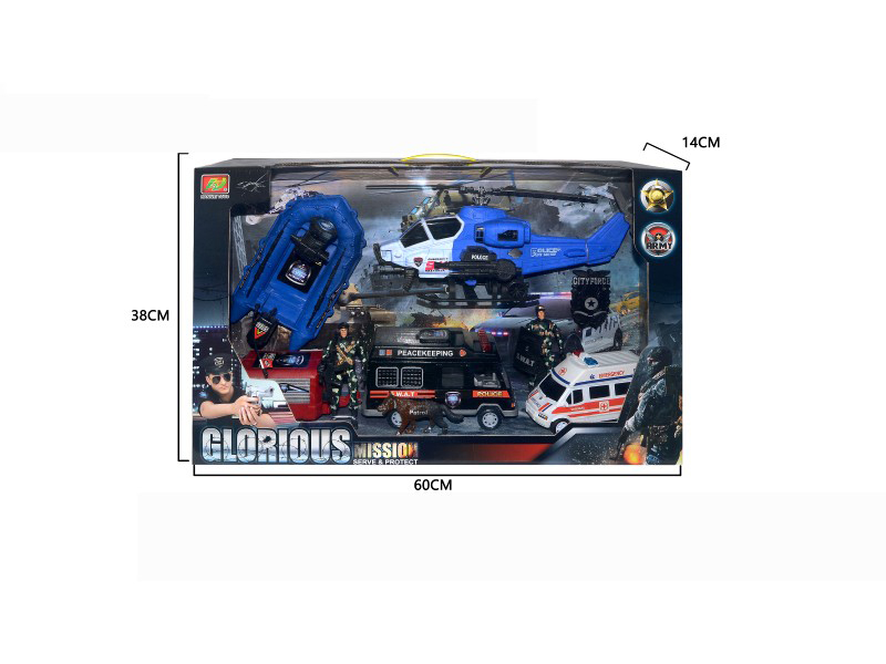 Sadrži brodić, helikopter, policijska vozila, figurice, i drugo