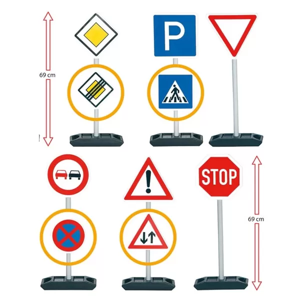 Komplet dvostranih saobraćajnih znakova. Set sadrži 6 znakova, 2 nalepnice sa oznakama različitih saobraćajnih znakova, kao i 6 postolja i 6 držača. Visina držača je 67cm.