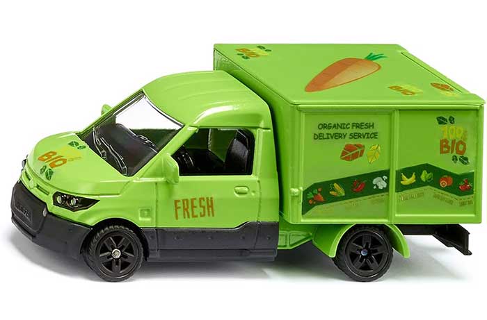 SIKU igračka automobilčić za decu električni dostavni kombi BIO proizvoda StreetScooter ima okretne točkove, vrata koja se otvaraju, kuku za prikolicu, slike organske hrane na kartonu i stikere za dekorisanje.