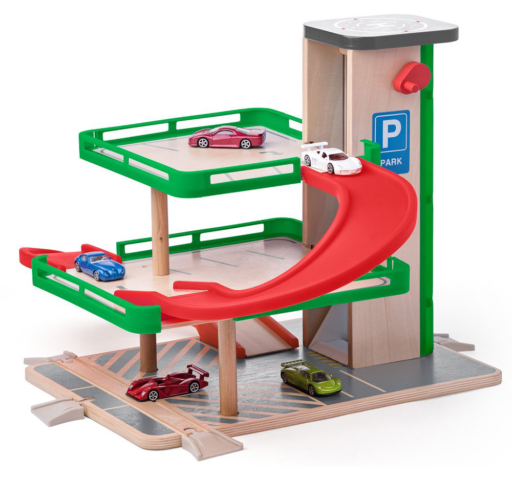 WOODY Garaža je velika! Ima tri nivoa, lift i heliodrom! Uz nju dolazi i 5 SIKU autića! Bonus je to što možeš da je povežeš sa WOODY železnicama, a tek onda maštovitoj igri nema kraja!