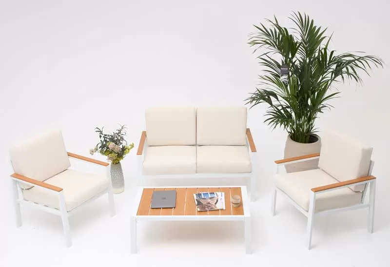 Ovaj elegantni set uključuje dvosed, dve fotelje i stočić, pružajući idealno mesto za opuštanje i druženje. Garnitura je izrađena od visokokvalitenog aluminijuma, dok su rukonasloni i ploča stola od polistirena.