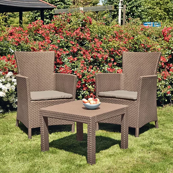 Rosario svojim elegantnim izgledom oplemenjuje prostor čiji je deo. 2 fotelje i sto napravljeni su od livene plastike koja je obložena Wicker prućem. Garnitura je besprekorno udobna i otporna na atmosferske uticaje...