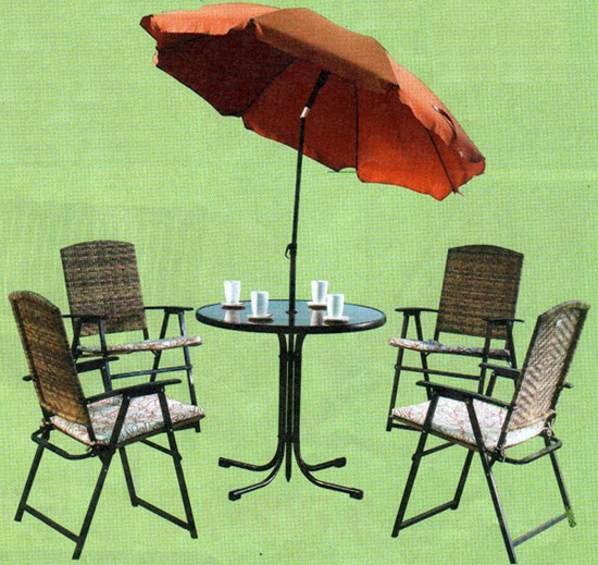 Komplet sadrži: 4 stolice sa jastucima, sto, suncobran