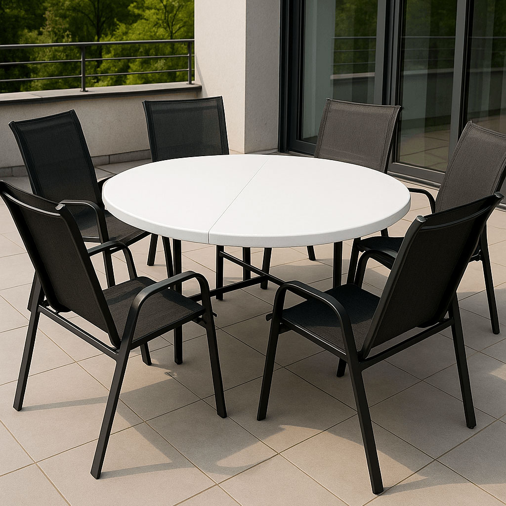 Funkcionalna garnitura za 6 osoba, idealna za okupljanja prijatelja, porodične proslave i druge prilike. Čini je 6 stolica koje se mogu slagati jedna na drugu, i sklopivi okrugli sto prečnika 150cm.