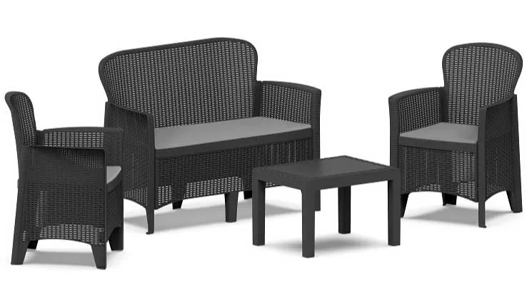 Kvalitetna, interesantno dizajnirana i praktična baštenska garnitura koju čine 2 fotelje i dvosed sa jastucima za sedenje i sto. Komplet je dizajniran i izrađen u Italiji u tamno antracit sivoj boji sa sivim jastucima. Nosivost po sedalnom mestu je 120 kg