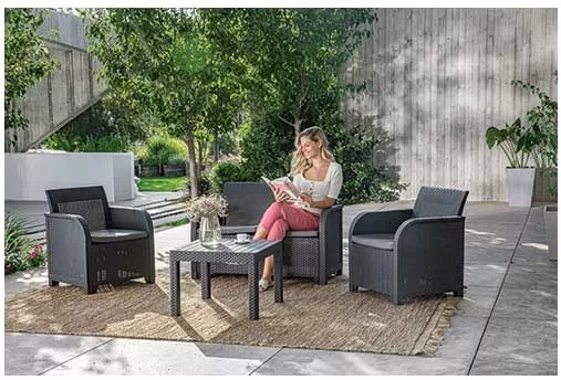 Udobni set Rosalie idealan je za bašte, balkone ili terase. Set se sastoji od udobnog dvoseda, dve fotelje i klasičnog stočića.