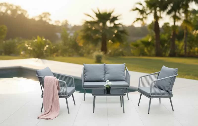 Učinite svoju terasu, balkon ili vrt savršenim mestom za odmor uz ovu savremenu baštensku garnituru dizajniranu za udobnost, stil i trajnost. Set donosi moderan izgled sa kombinacijom čelične konstrukcije, pletenog ratana i udobnih jastuka – idealan za už