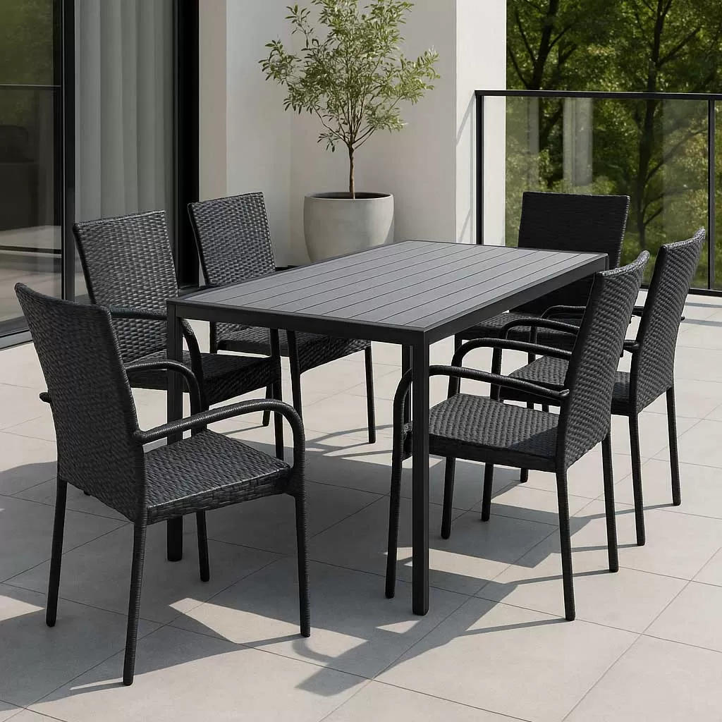 Praktična baštenska garnitura koju čini 6 ratan stolica i sto. Konstrukcija stolica je od čelika, a pletivo je od PE ratana. Konstrukcija stola je od aluminijuma, a ploča od polywood-a. Dimenzije stolice su: 55 x 63 x 94 cm, a stola: 80 x 140 x 74 cm.