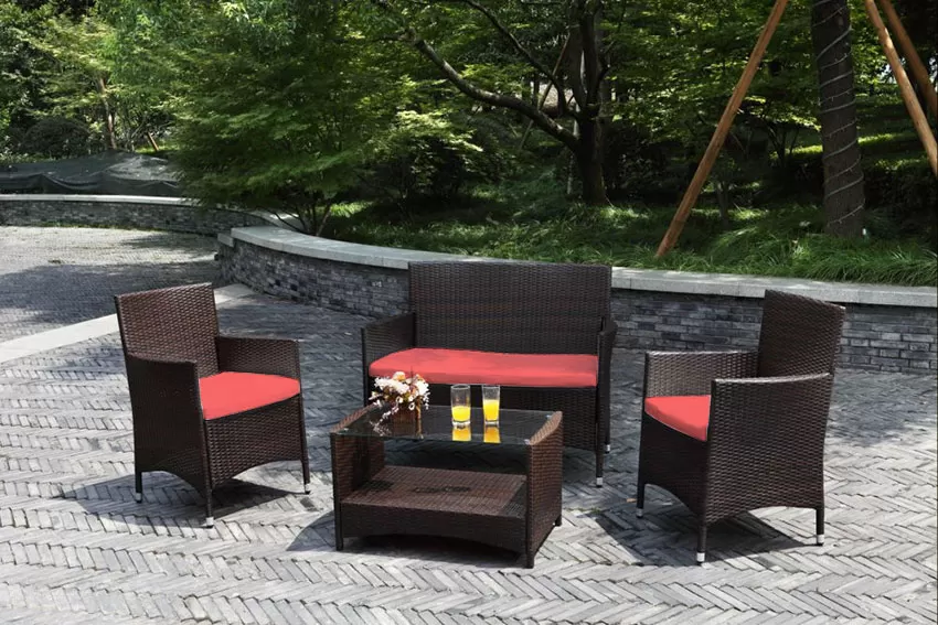 Baštenski Set Od Wicker Ratana Quito - 2 Fotelje, Dvosed i Sto Sa Staklom - Crveni Jastuci