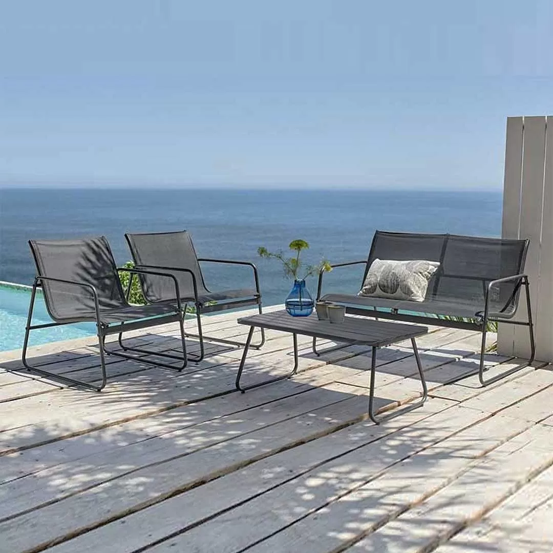 Baštenska garnitura za dvorište ili terasu, a moguće ju je koristiti i u nekom prigodnom unutrašnjem prostoru. U paketu dobijate 2 prostrane fotelje, dvosed i sto. Konstrukcija svih delova garniture napravljena je od čelika koji je zaštićen premazom.