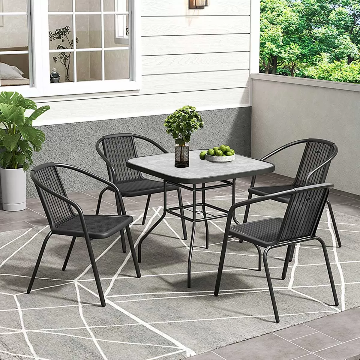 Baštenska garnitura koju čine četvrtast sto 61 x 61 x 73 cm i 4 stolice od polietilena sa ratan teksturom i čeličnom konstrukcijom. Sve ovo kvalifikuje ovu garnituru kao idealnu za manje spoljne prostore kao što su: terasa, balkon, manje dvorište.