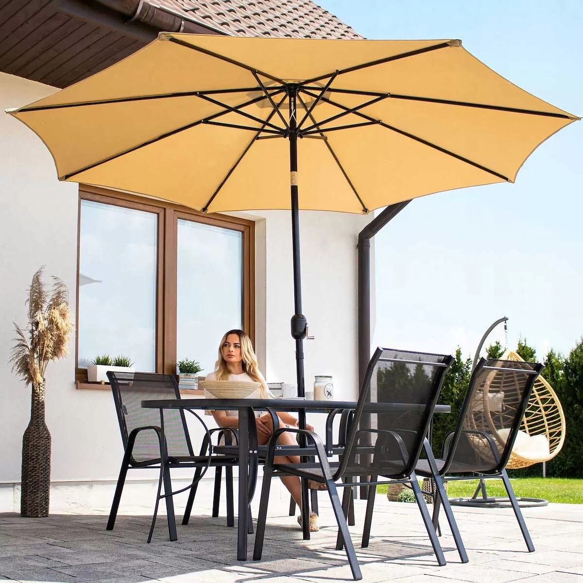 Komplet čine 4 stolice, veliki sto sa staklom i suncobran sa mehanizmom za podizanje i spuštanje