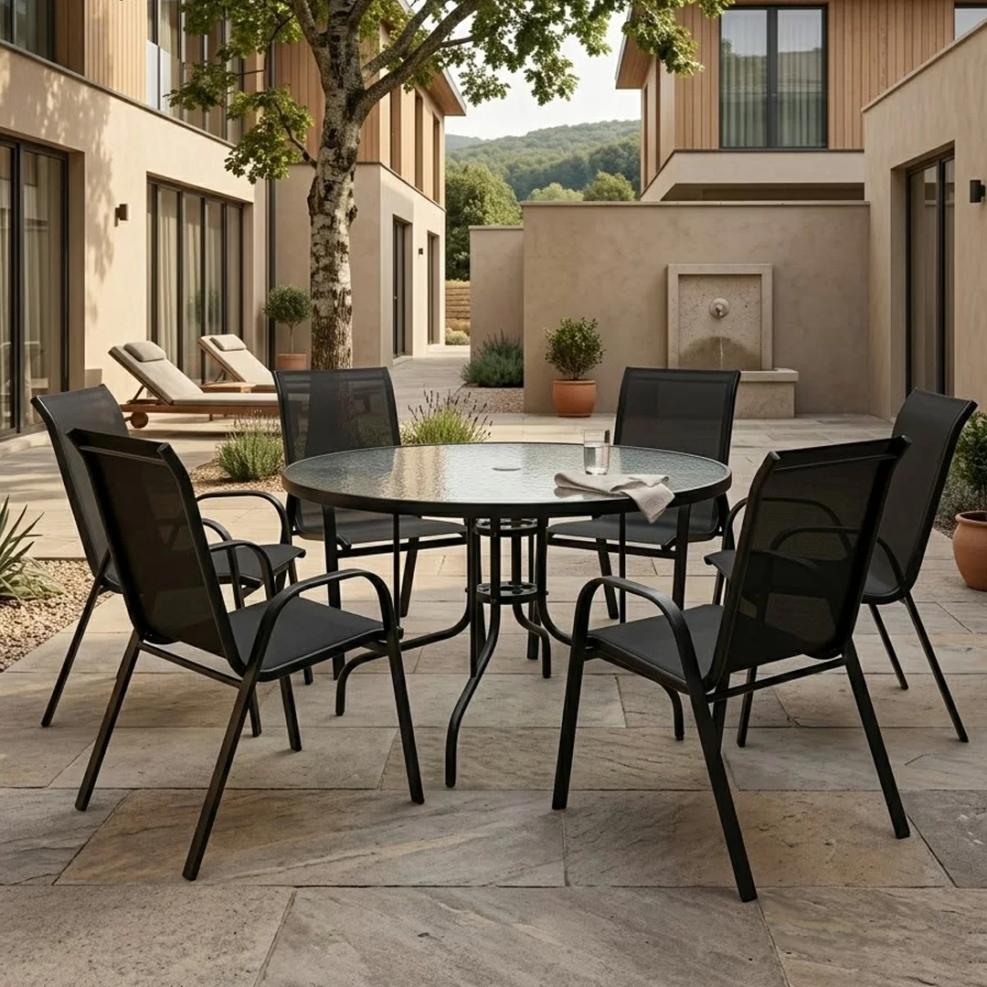 Ova garnitura za 6 osoba je idealna za prostrane terase, dvorišta, moderne balkone ili ugostiteljske objekte, što se može videti i na našim fotografijama (image_142.png, image_143.png). Sto prečnika 100cm, sa pločom od kaljenog stakla (5mm), ne samo da je prelep za oko, već je i izuzetno čvrst i bezbedan. Njegova čelična konstrukcija zaštićena premazom u prahu osigurava dugotrajnost i stabilnost, a crna boja daje prelep kontrast sa staklenom pločom i okruženjem.