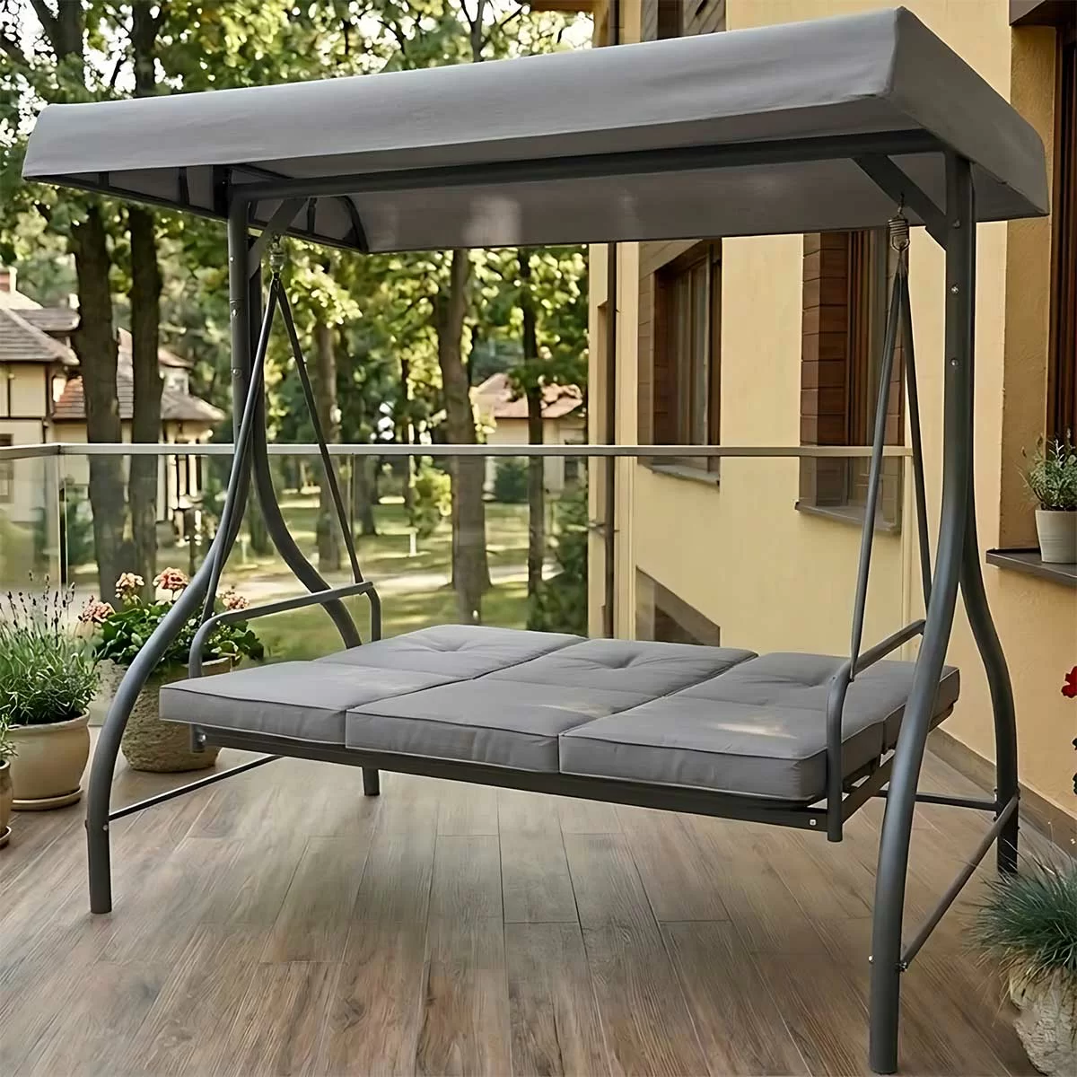 - Ljuljaška-Krevet: Garnituru čini ljuljaška-krevet koja se jednostavno pretvara iz ljuljaške u krevet pomoću dve kopče. Njene ukupne dimenzije (192 cm x 120 cm x 171 cm) osiguravaju udobno sedenje, a konstrukcija od čelika, identično zaštićena premazom u prahu, garantuje dugovečnost.