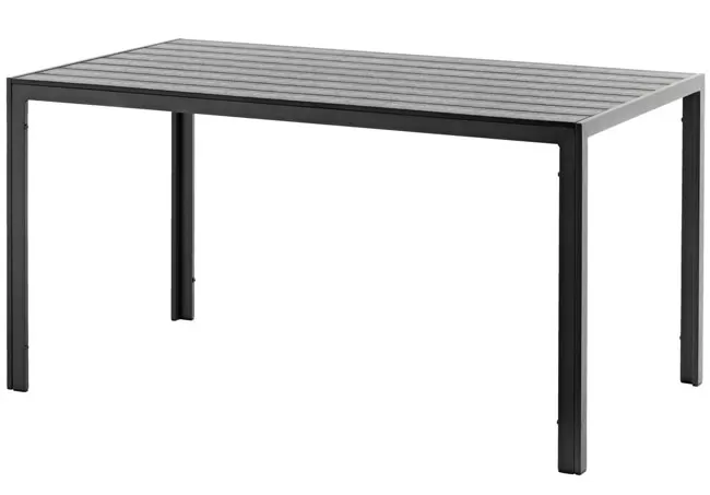 Stabilan i čvrst baštenski sto sa konstrukcijom od aluminijuma i površinom od veštačkog drveta. Dimenzije: 140x80x74cm.