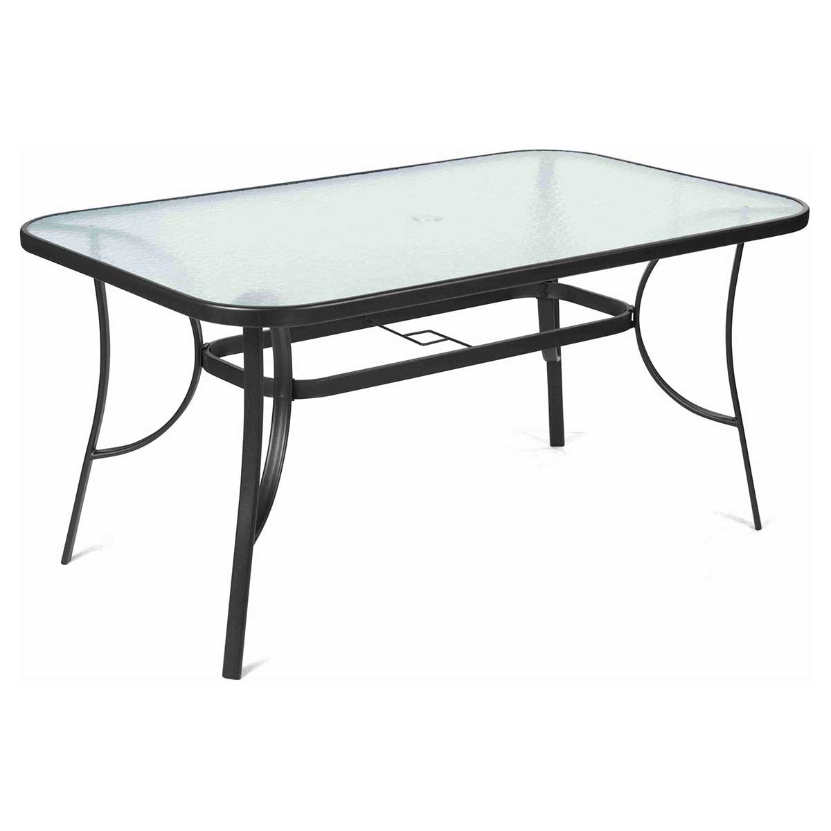 Baštenski sto čija je konstrukcija od aluminijuma, a ploča stola je od kaljenog stakla debljine 5 mm. Dimenzije stola su 150 x 90 x 71 cm. Na sredini stola je otvor za postavljanje suncobrana. Savršen za spoljnu ili unutrašnju upotrebu.