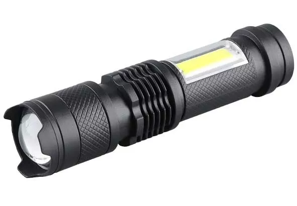 Džepna LED lampa sa punjivom baterijom i više režima rada. Baterija se puni preko USB priključka (punjač nije deo kompleta).