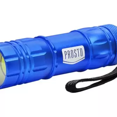 LED baterijska lampa sa aluminijumskim kućištem plave boje. Lampa ima COB LED diodu snage 3W. Za rad su potrebne 3 AAA baterije.