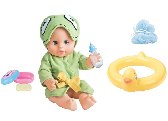 Set sadrži: 1 lutku, bademantil, gumu za kupanje, sapun, kutiju za sapun, mrežicu za kupanje i flašicu