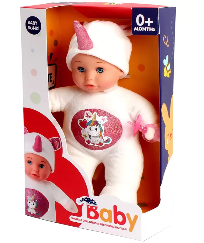 Mekana plišana lutka 30cm u kostimu jednoroga sa cuclom i sa zvučnim i svetlosnim efektima koji se pokreću pritiskom na mehanizam u stomaku lutke. Može služiti kao noćno svetlo.