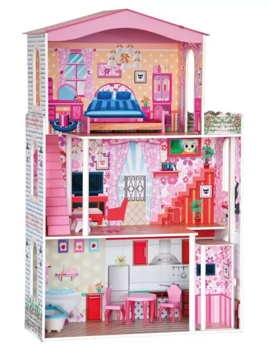 Ova drvena kućica će biti dom svim tvojim barbikama i njihovim lutkama drugaricama! Ima dva sprata, lift koji radi, stepenište, terasu, divan nameštaj. Ima mesta za sve! Visina 116cm. Za uzrast 3+.