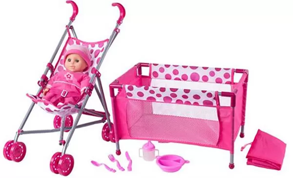U pakovanju: lutka beba, kolica za lutke, krevetac za lutke, posuđe za hranjenje