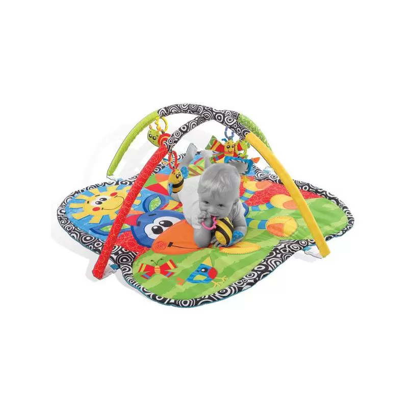 Playgro vežbaonica - široka prostirka, različitih motiva i intenzivnih boja. Prostirka je za kretanje a ima šuškave elemente i ogledalo.