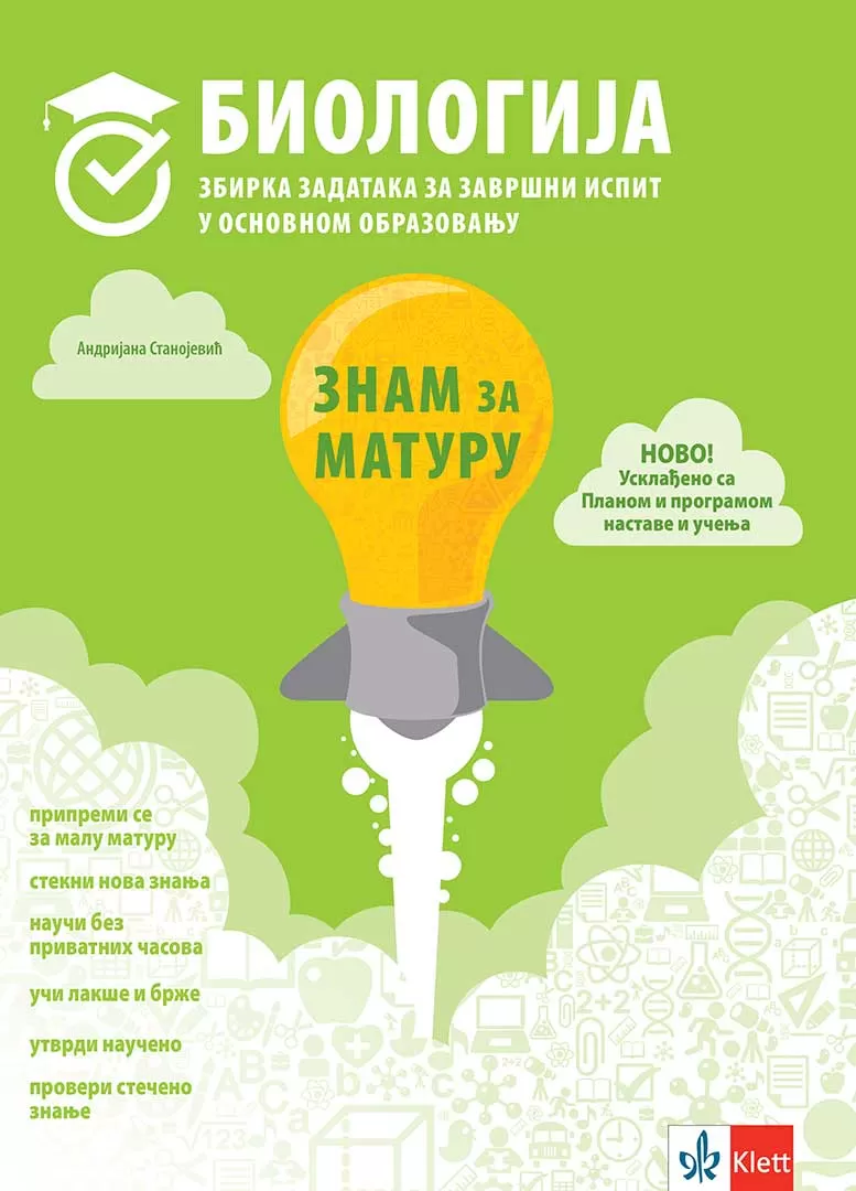 Znam za maturu - biologija je zbirka zadataka namenjena pripremi završnog ispita u osnovnom obrazovanju. Ukupno sadrži 301 zadatak i 1 test.