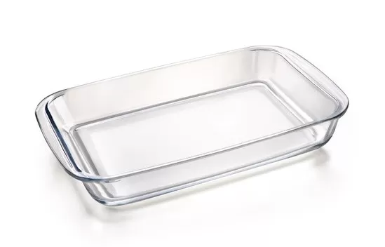 Vatrostalna staklena činija pravougaonog oblika sa rukohvatima za pripremanje hrane u rerni