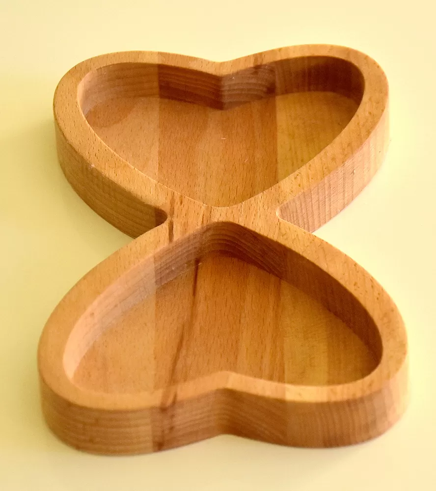 Činija u obliku dva srca od drveta bukve. Dimenzije: 19x12cm. Materijal: drvo bukve.