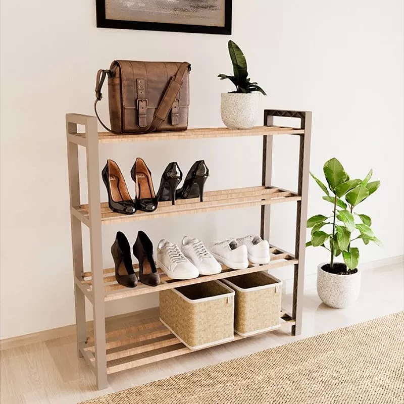 Dekorativna polica za cipele sa četiri nivoa, idealna za organizaciju obuće u predsoblju. Širina police dozvoljava odlaganje tri do četiri para obuće po nivou, zavisno od njihove veličine. Otvoreni dizajn omogućava bolji pregled dostupne obuće, a prozračn