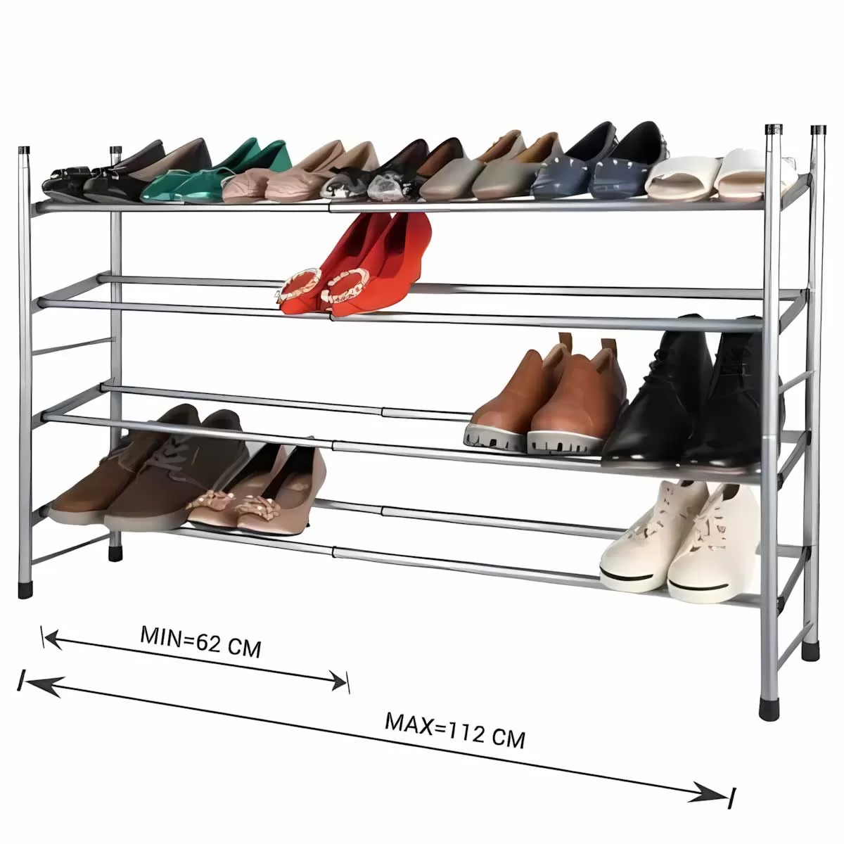 Praktična i jednostavna polica za obuću. Namenjena je za maksimalno 20 do 24 pari obuće. Napravljena je od metala, a širinu možete podešavati po potrebi, minimalna je 62 cm, a maksimalna 112 cm. Visina police je 66.5 cm, a moguće je drugu policu...