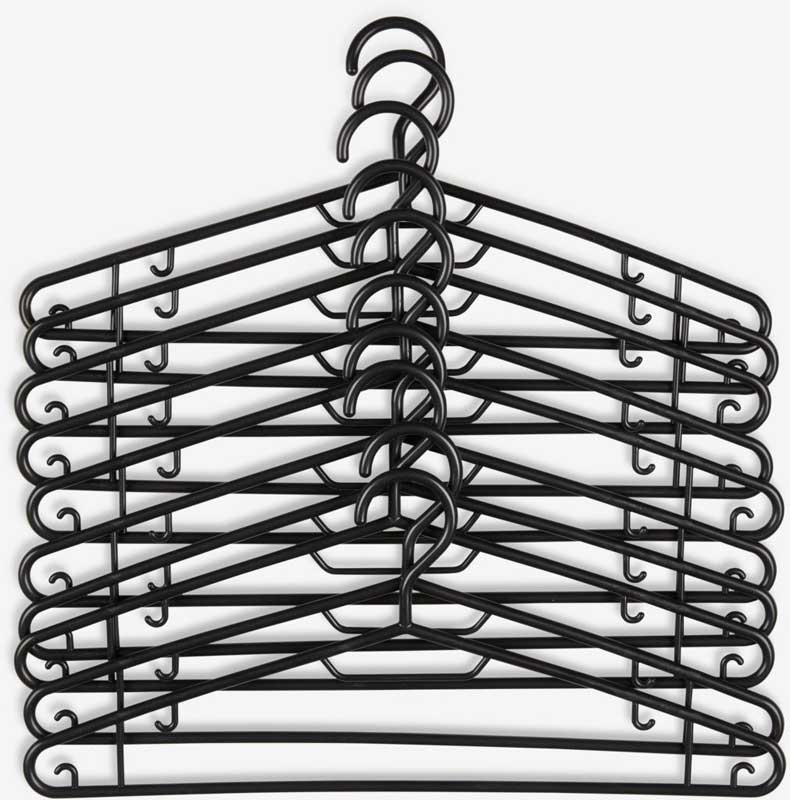 Pakovanje od 10 crnih vešalica od izdržljive plastike. Elegantni dizajn štedi prostor, a dodatne kukice nude raznovrsne opcije kačenja.