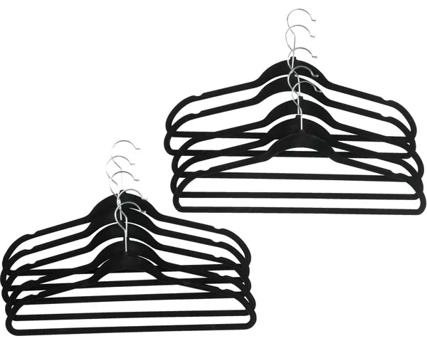 Pakovanje od 10 crnih vešalica sa somotskom površinom koja sprečava odeću da spadne sa vešalica. Vešalice su tanke i omogućava da se prostor u ormaru dobro iskoristi.