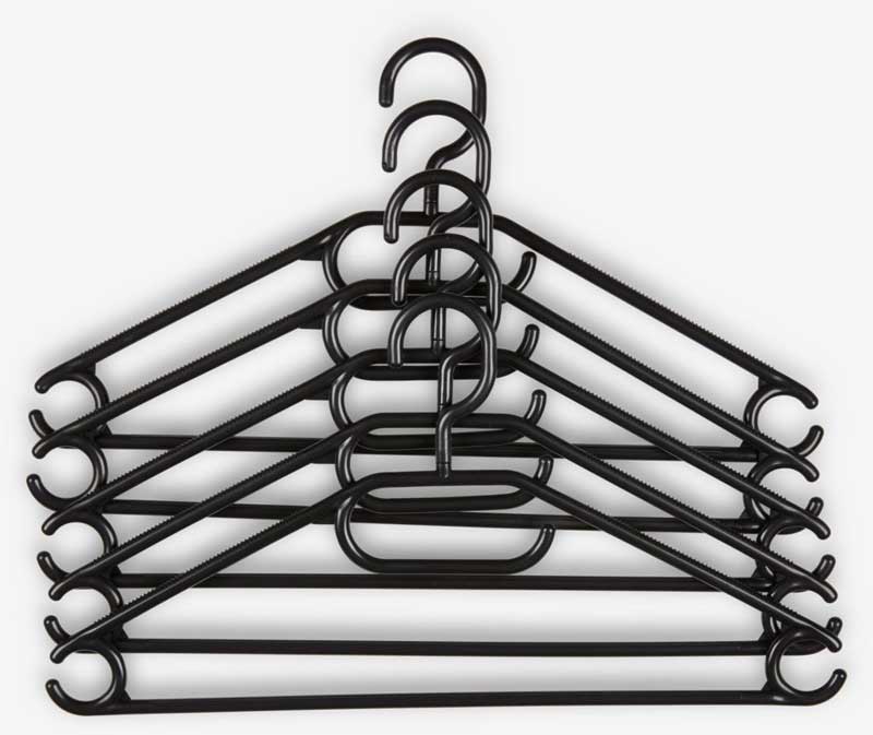 Pakovanje od 5 crnih vešalica izrađenih od izdržljive plastike. Elegantni dizajn štedi prostor, a dodatne kukice nude raznovrsne opcije kačenja.