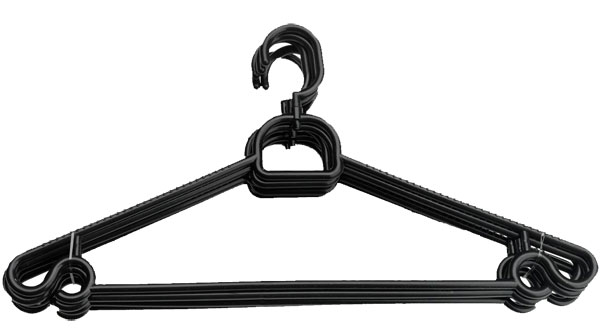 Pakovanje od 10 crnih vešalica od izdržljive plastike. Elegantni dizajn štedi prostor, a dodatne kukice nude raznovrsne opcije kačenja.