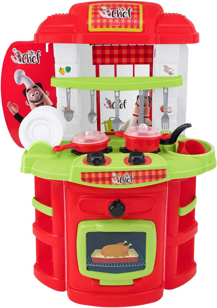 Interesantna, od kvalitetne plastike, lepa dečija kuhinja sa opremom za pripremanje i serviranje jela. Dimenzije kuhinje su 56 x 57 x 18 cm, od pribora tu su šerpe, tacne, šolje, šerpe. Ringle i rerna dolaze sa potenciometrima.