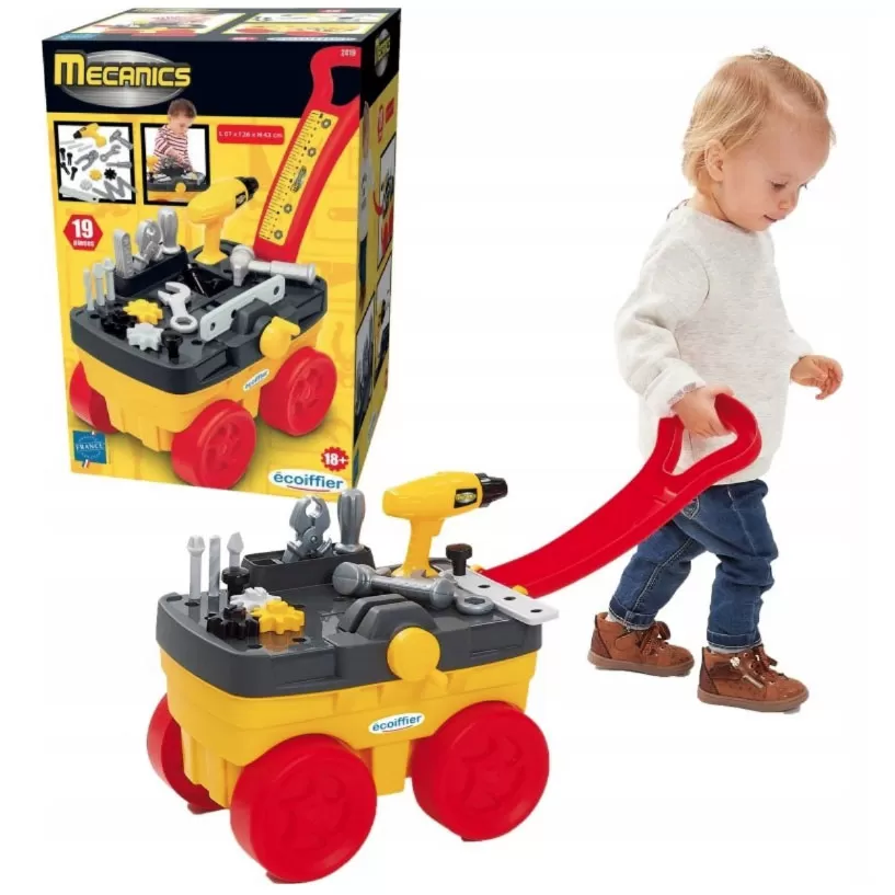 Ecoiffier mehaničarski set se sastoji od 19 delova među kojima su transportna kolica za odlaganje ili prevoz igračaka s jednog na drugo mesto.