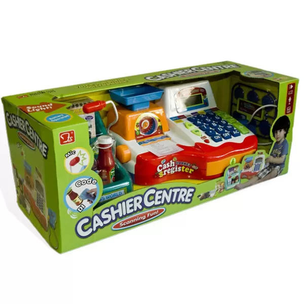 Mini market set sadrži veliku registar kasu na baterije sa digitronom, vagom, barcod čitačem, a sa posebnom mogućnošću plaćanja za keš ili putem platnih kartica - koji se takođe nalaze u pakovanju - papirni novac, metalni novac i kartica za plaćanje.