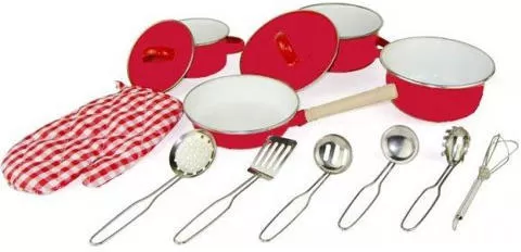 Komplet sadrži dve šerpice, dva poklopca, činiju, tiganj, pribor, rukavicu