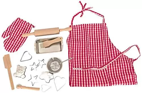 17 delova: kecelja, kuvarska rukavica, oklagija, modle za kolače, spatula, radla, četkica za premazivanje, mutilica, činija, pleh za pečenje