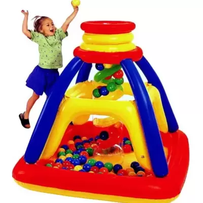 Bazenčić za decu na naduvavanje, sa šarenim zidićem i krovom za zaštitu od Sunca. Tu su i loptice za ubacivanje u specijalni otvor na zidiću bazena....