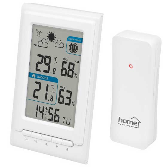 Kućna meteo stanica sa spoljnim senzorom prikazuje spoljnu i unutrašnju vlažnosti vazduha i temperaturu, kao i trend promene temperature. Poseduje i budilnik sa funkcijom odlaganja.