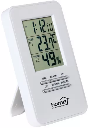 Digitalni stoni sat sa termometrom meri temrperaturu. Meri temperaturu od -9 do +50°C i vlažnost vazduha od 20% do 90%. Sat se može postaviti ne neku radnu površinu ili se može zakačiti na zid.