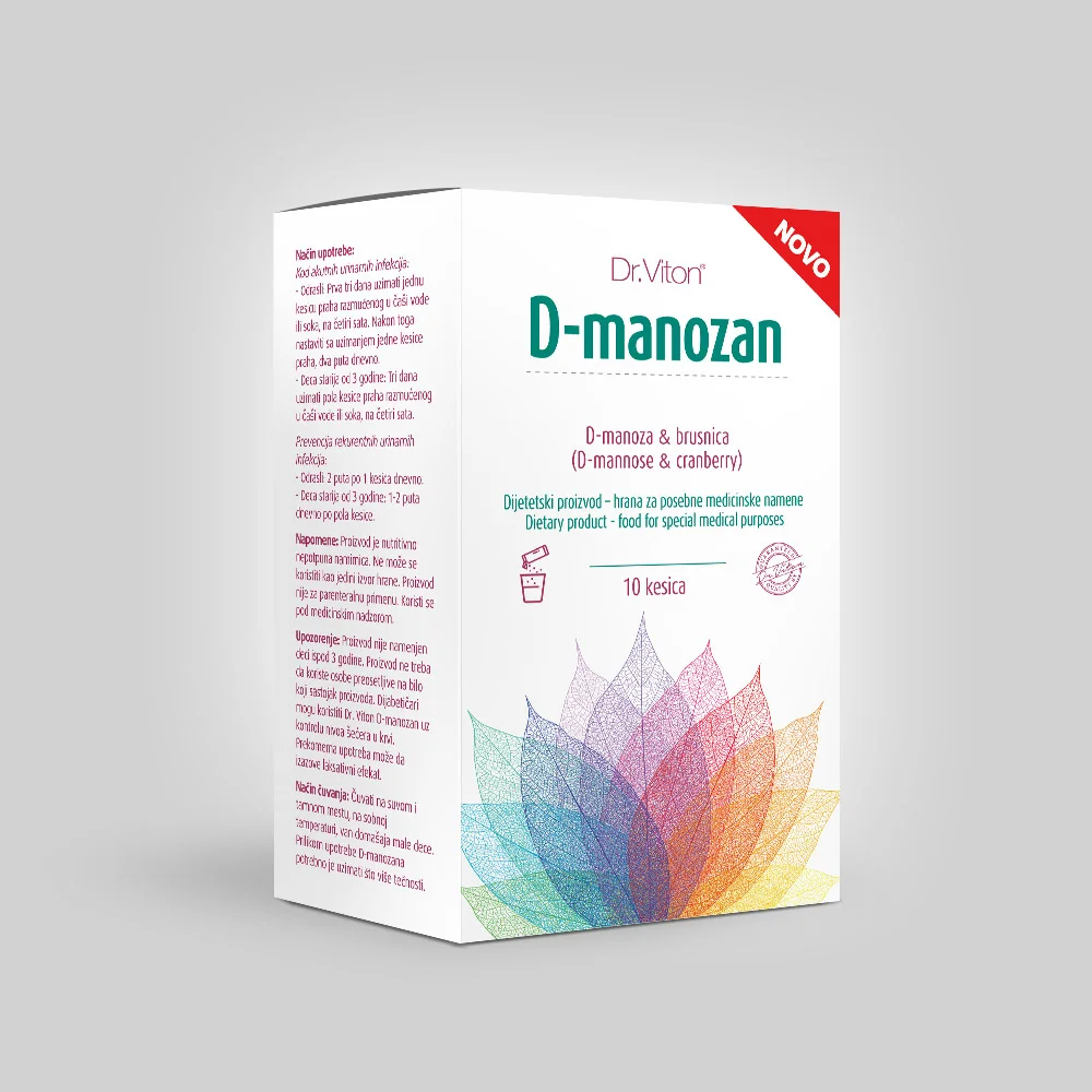 Dr. Viton D – manozan sadrži kombinaciju D – manoze i brusnice, koji sprečavaju vezivanje bakterije Escherichia coli za zidove urinarnog trakta i na taj način pomažu u borbi protiv urinarnih infekcija.