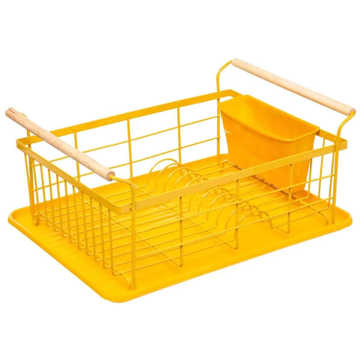 Metalni Oceđivač Za Posuđe Sa Podlogom i Drvenim Ručkama Žuti - 5five Simple Smart